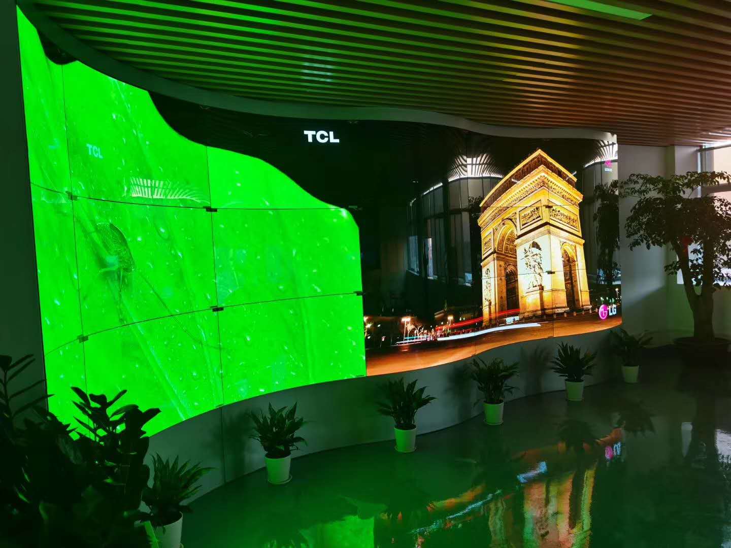 LCD需要背光源发光,且有许多感光层组成,整体厚度达5公分左右,而且只能平面式拼接。