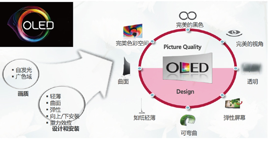 自发光、广色域、轻薄、曲面拼接、弹性、可弯曲、透明。